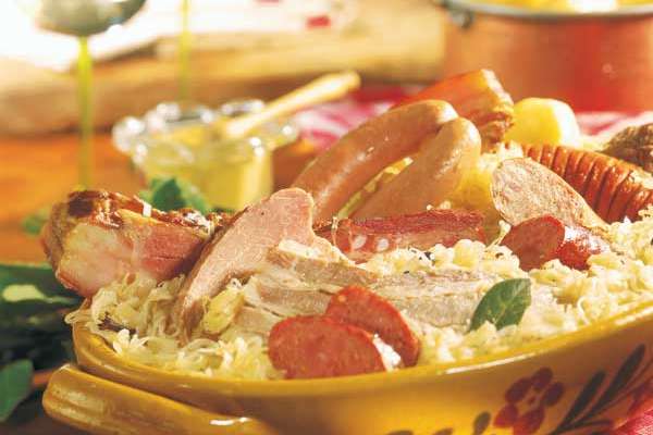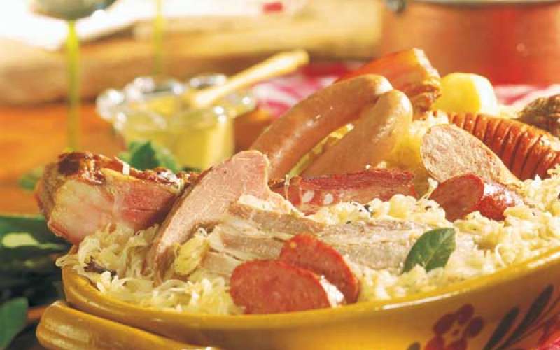 This form of pickled cabbage is finely sliced and fermented. 75% of French production comes from Alsace. "Choucroute garnie" is sauerkraut cooked in white wine with a selection of salted and smoked meats, pork meats and potatoes. Pork is the most commonly used meat, but goose is also used, as is fish.