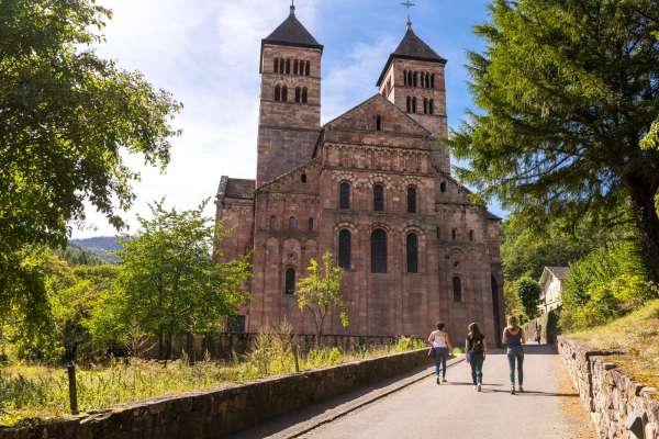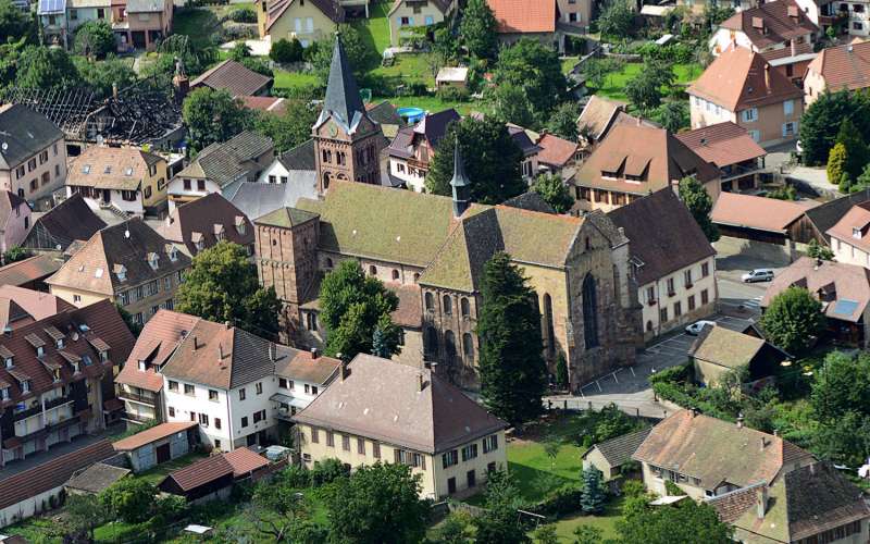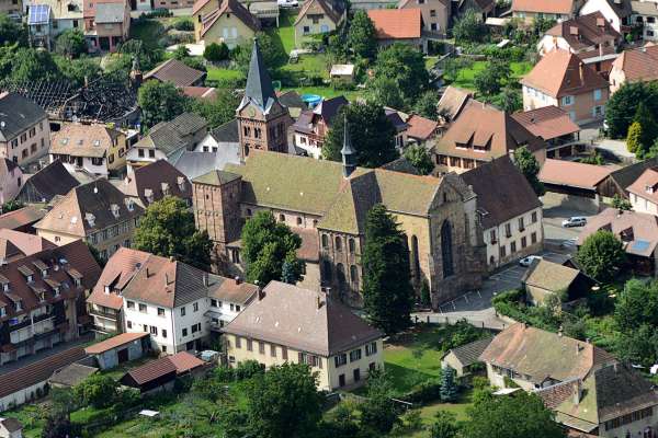 "Die alte Stiftskirche St. Michael und Gangolphus wurde im Laufe der Jahrhunderte mehrmals umgebaut. Das Langhaus stammt vermutlich aus dem 11. Jahrhundert; das Transept, der Chor und die Flachapsis aus dem 12. Jahrhundert. Ihr Vorraum mit Gewölbe ist einer der schönsten im Elsass. Das Bauwerk wurde jedoch im Jahre 1859 komplett renoviert. Die Ornamente und Erweiterungen, wie die Türme, die vom Architekten des 19. Jahrhunderts ausgeführt wurden, sind, auch wenn sie die Gesamtharmonie des Bauwerks nicht beeinträchtigen, dennoch umstritten.