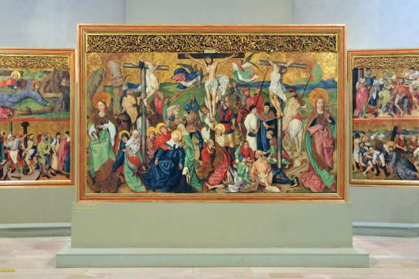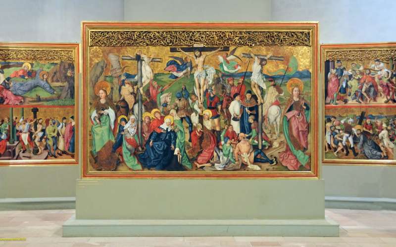 Das Retabel, das der Schule Martin Schongauers zugeschrieben wird, weist alle Techniken der Werke der frühen Renaissance, wie Andeutungen von Perspektiven, Gold mit Gravuren, schillernde Farben, tiefe Gewänderfalten und Brokatapplikationen auf. Dieses Werk im typisch rheinischen Stil hat beeindruckende Dimensionen: sein Mittelteil hat eine Höhe von 1,97 m und eine Länge von 3,50 m (ausgeklappt ist es 7 m lang)."
