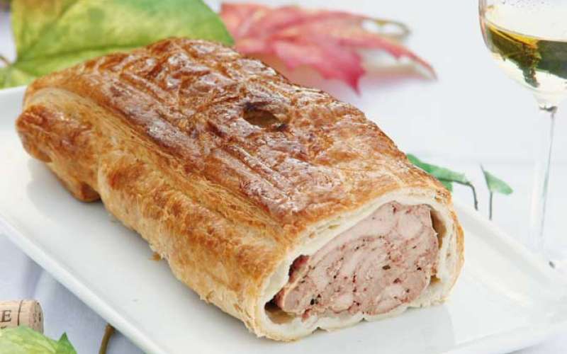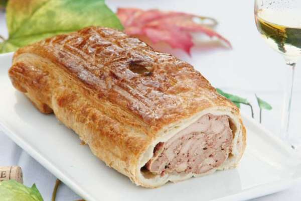 Die Pastete warm mit grünem Salat der Saison und Salat aus gekochtem Sellerie servieren. Als Getränk gehört ein Pinot Gris dazu.