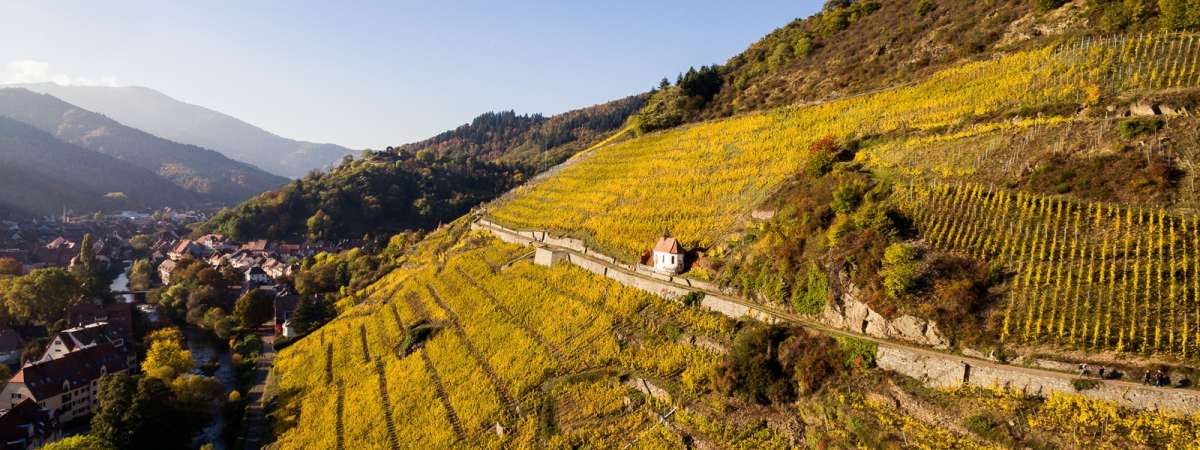 Leaving from the town of Thann, the southern gateway to the Alsace Wine Route, a walk through vineyards and forests. Head for the Waldkapelle, a chapel nestling in the middle of the forest, then for the cross overlooking the famous Rangen vineyards, with the steepest slopes in Alsace!